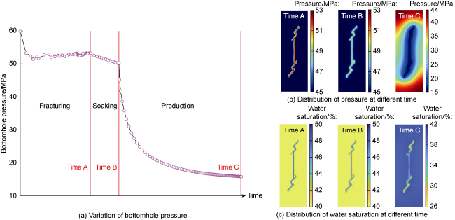Fig. 12. Variation of bottomhole pressure at different stages and distribution of pressure and water saturation at different time. |