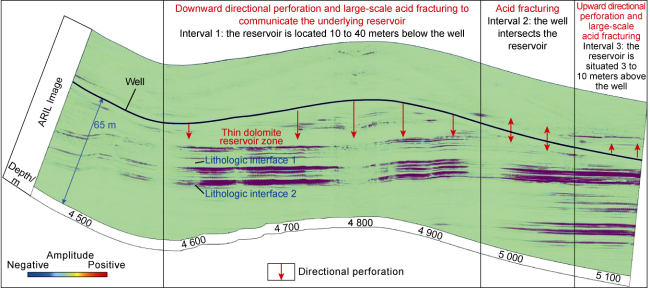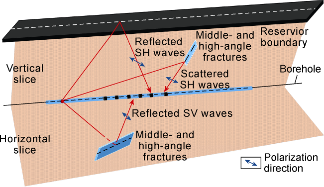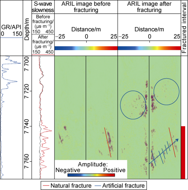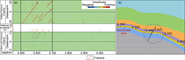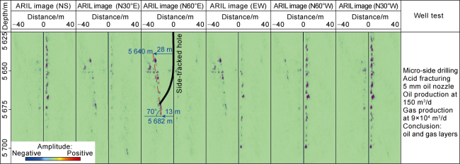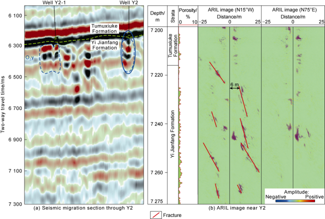 Fig. 4, the geological data from the study area indicate that a fracture-vug system was developed around Well Y1 under the jointing influence of faults and karst, but gas measurement found no oil or gas display in the well, and the interpretation of conventional well logging data provided a dry layer. All these findings may prove that the well did not encounter the fracture-vug system. In order to further verify the development of the fracture-vug system around Well Y1, we processed the ARIL data using the reflected waves step-by-step extraction method, and finally extracted the reflected S-waves representing the fracture-vug system after successively suppressing noises such as low- and high-frequency noise, formation interface waves, and multiples (