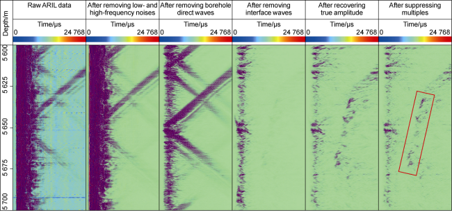 After understanding the principle of the ARIL method, it is necessary to utilize digital signal processing techniques to extract reflected waves from well logging data that represent fractures and vugs outside the well, and to perform migration imaging on them. The extraction of reflected waves is the foundation of data processing and interpretation because the accuracy of the data directly affects the subsequent imaging quality of reflectors. Considering a big acoustic impedance difference between the drilling fluid in the well and the surrounding formations outside the well, most acoustic energy will be confined within the well, and become guided waves such as Stoneley waves that propagate along the well wall. Only a small portion of the energy can be reflected back after entering the formation. Researchers focused on how to suppress the mode waves near the well, and proposed a series of signal processing methods such as Radon transform and multi- scale correlation to filter out the mode waves