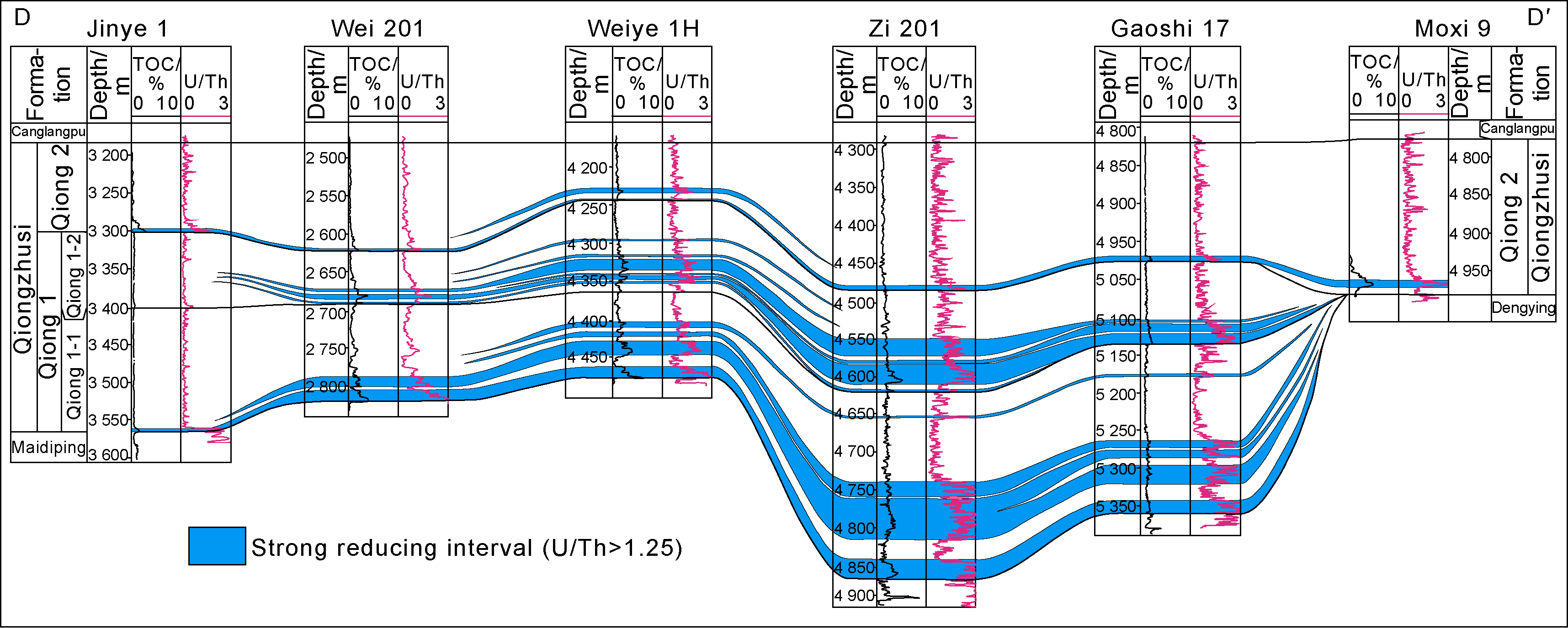 Fig. 7. Well-tie section of strong reducing intervals in the central part of the Deyang-Anyue aulacogen (section location shown in |