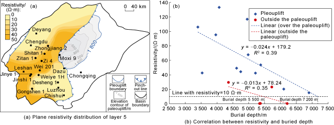 Fig. 10. Relationship between resistivity and burial depth of layer 5 in the Qiongzhusi Formation, Sichuan Basin. |