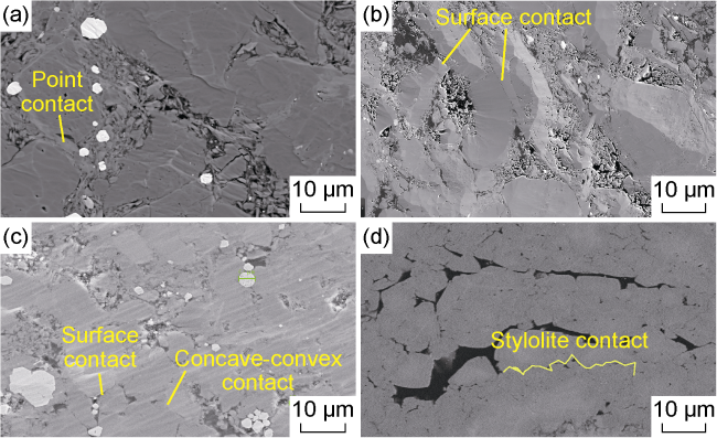 Fig. 12. Diagenetic differences inside and outside the aulacogen-uplift overlap area. (a) Well Zhongjiang 2, inside the overlap area, layer 5, SEM; (b) Well Gaoshi 17, inside the overlap area, layer 5, SEM; (c) Well Wei 201, at the edge of the overlap area, layer 5, SEM; (d) Well Ning 208, outside the overlap area, layer 5, SEM. |