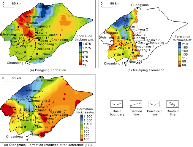 Fig. 2. Thickness distribution of the Dengying, Maidiping, and Qiongzhusi Formations in the Sichuan Basin. |