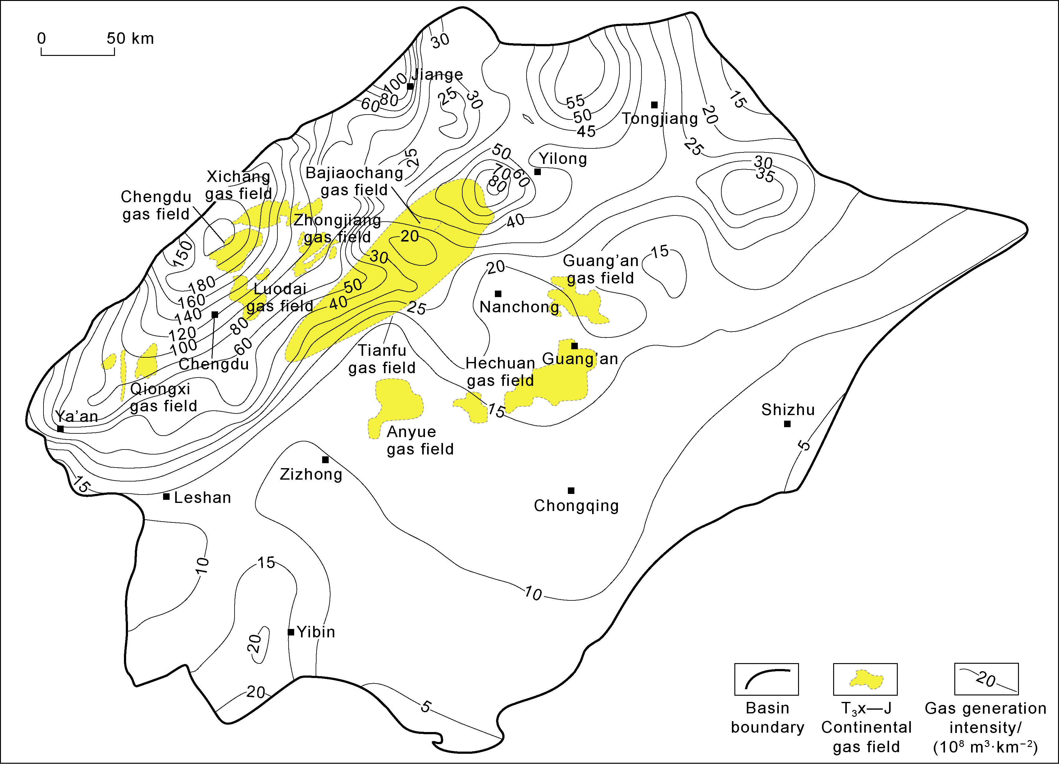Fig. 2. Gas generation intensity of Xujiahe Formation coal-measure source rock and distribution of continental tight gas fields in the Sichuan Basin. |