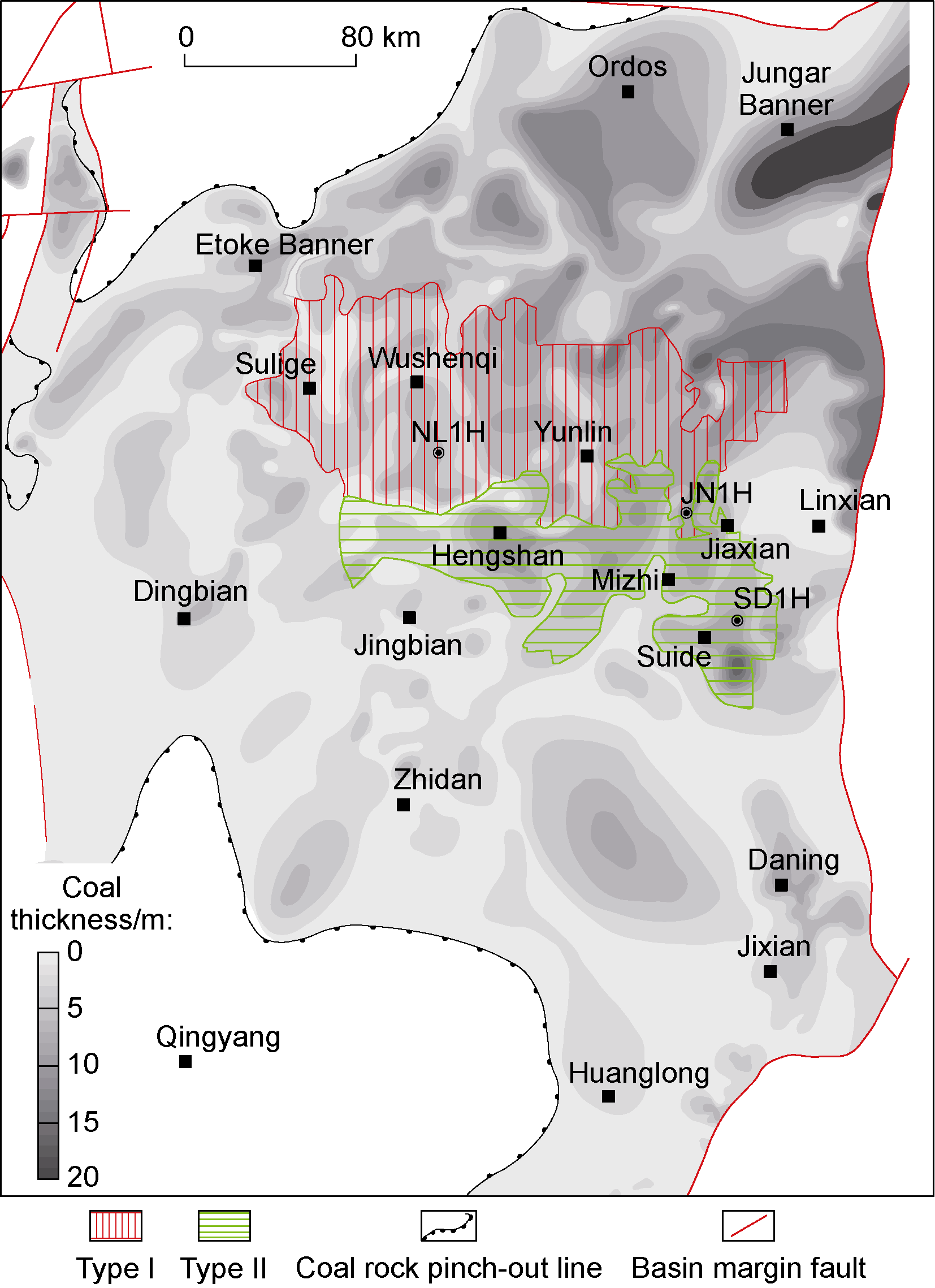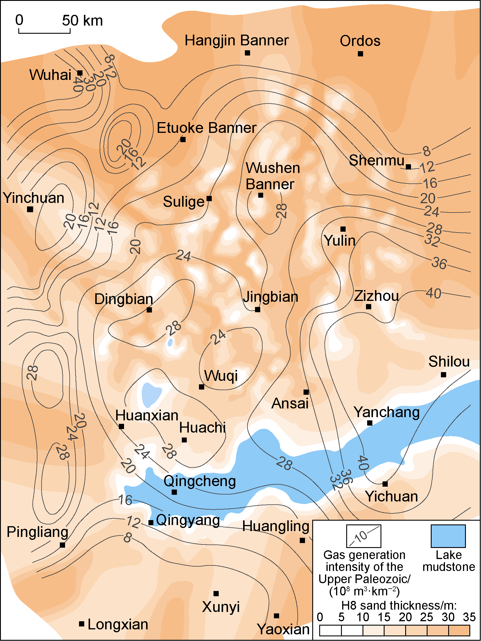 Fig. 7. Thickness contours of the Lower Permian H8 in the Ordos Basin. |