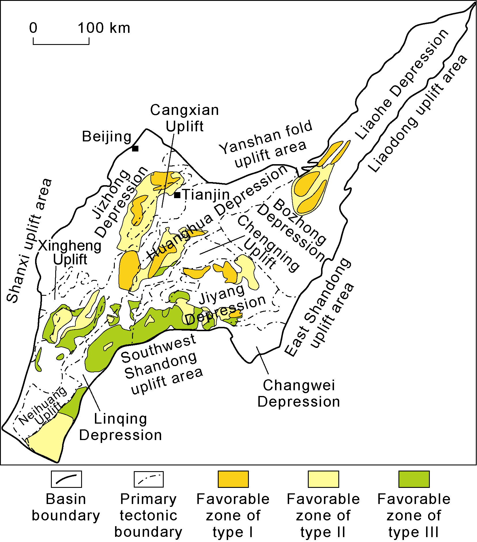 Fig. 8. Evaluation on favorable exploration zones of Permian tight sandstone gas in the Bohai Bay Basin (after Reference [69]). |