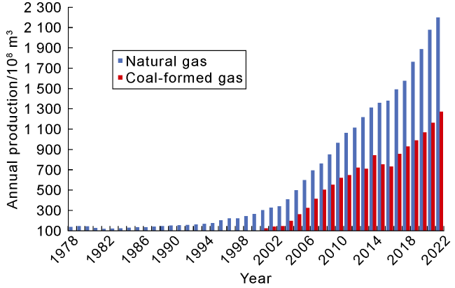 Fig. 3. Change of annual production of natural gas and coal-formed gas in China from 1978 to 2022. |