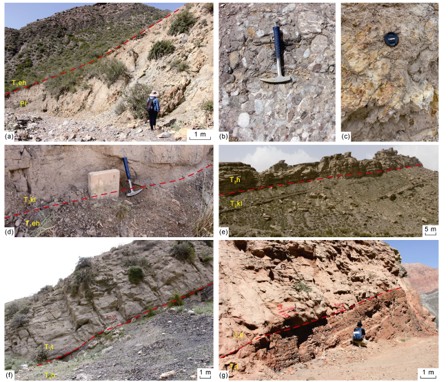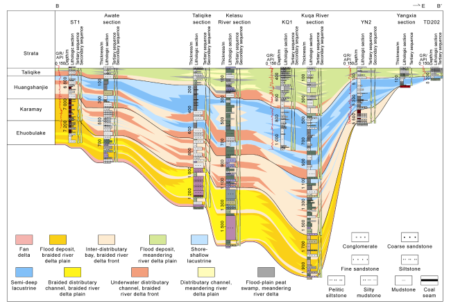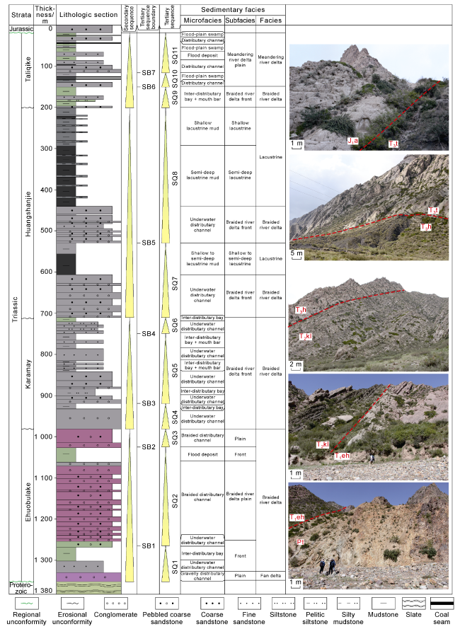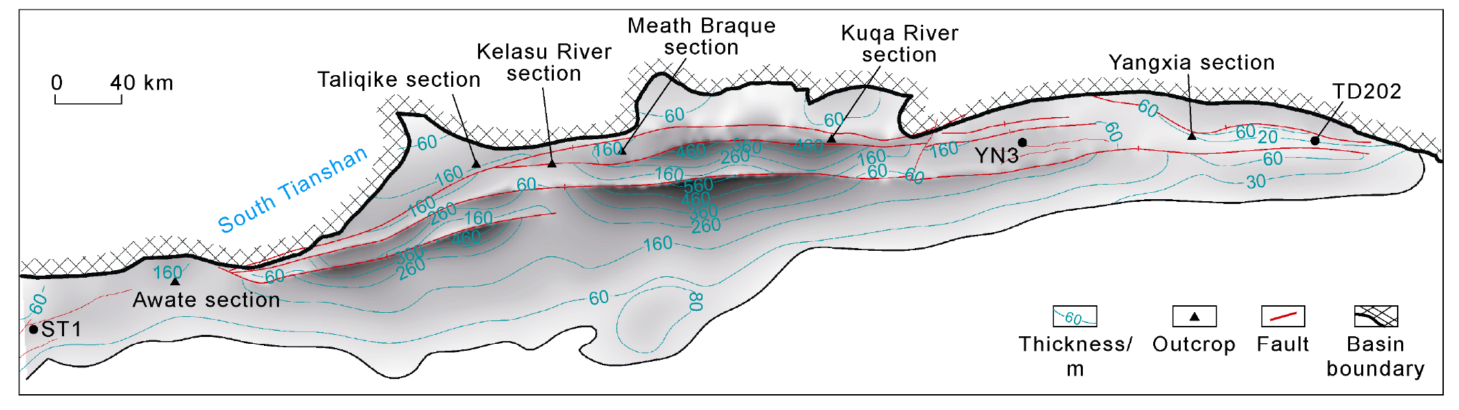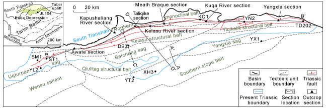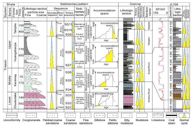 [10⇓-12]. However, in the outcrop survey, the eastern depression was revealed to lack in coarse-grained clastic deposits, as shown by the Yangxia outcrop section. Drilling data from some wells (e.g. SM1) showed intense denudation at the late stage in the Uqturpan sag, where there are no interbedded sandstones and mudstones in the Taliqike Formation, which is contradict preceding conclusions. Preceding studies focused on the middle part of the north structural belt in the Kuqa Depression instead of the overall sedimentation in the Triassic period. As per the latest researches, the Kuqa Depression features episodic thrusting activities, which had a strong impact on sedimentary formations and led to complicated sequence stacking and sedimentary filling history