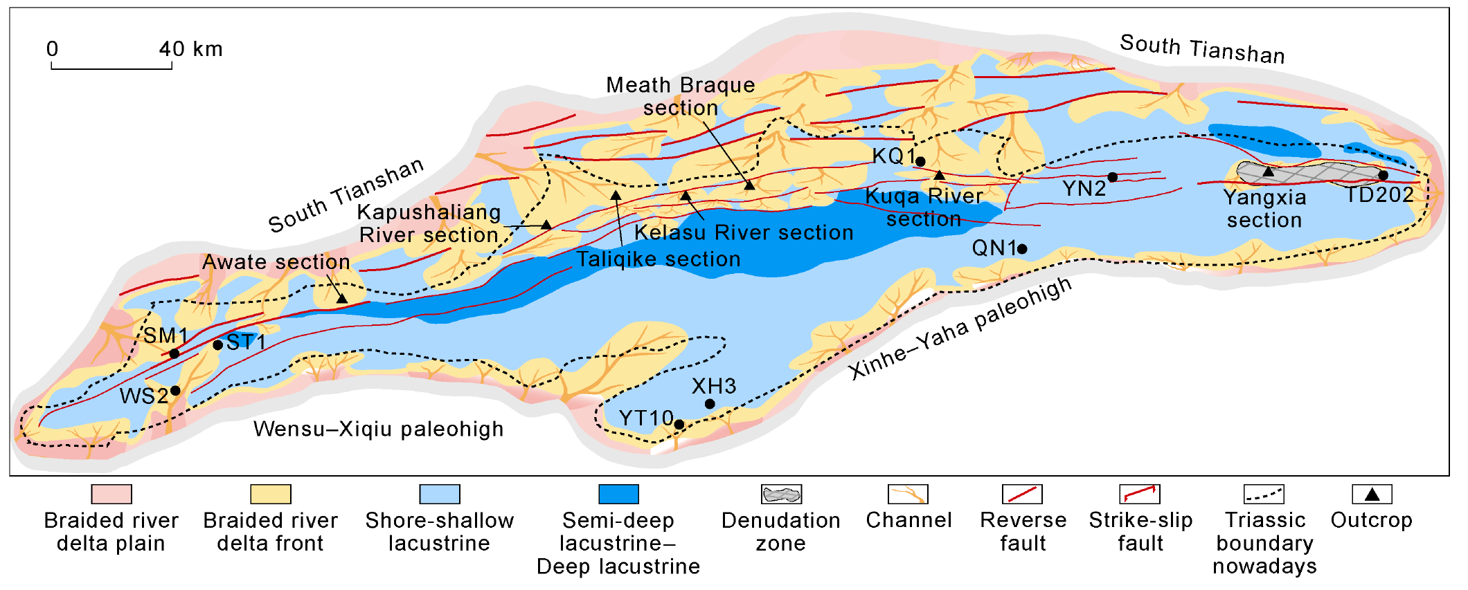 [7⇓-9], the Kuqa Depression was deposited with a sedimentary system comprising braided river deltas and lakes mainly and thick alluvial fan deposits in the north piedmont zone in the northward subduction process of the Tethys Ocean in the Triassic