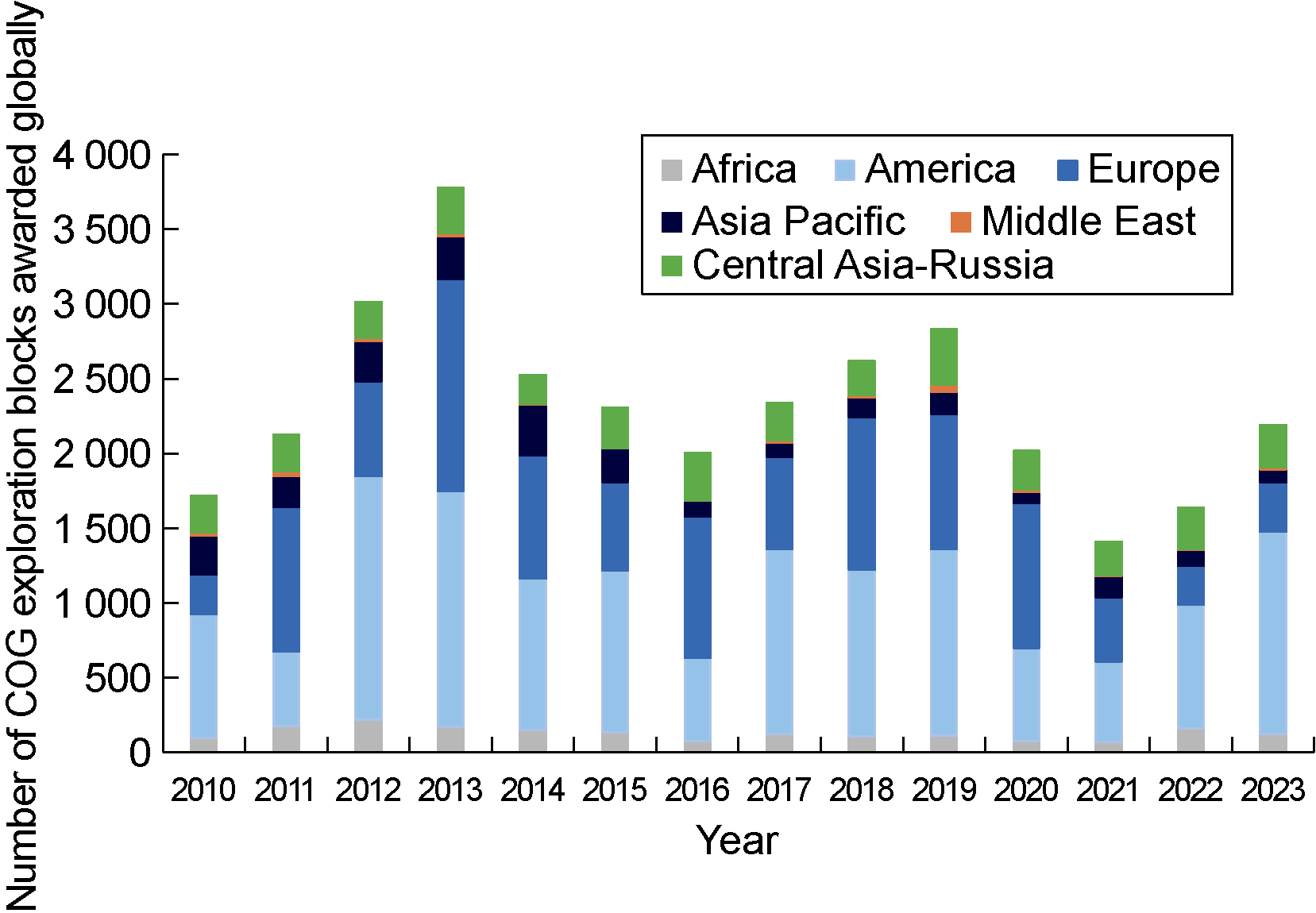 Fig. 2. Histogram of the year distribution and regional distribution of COG exploration blocks awarded globally [6]. |