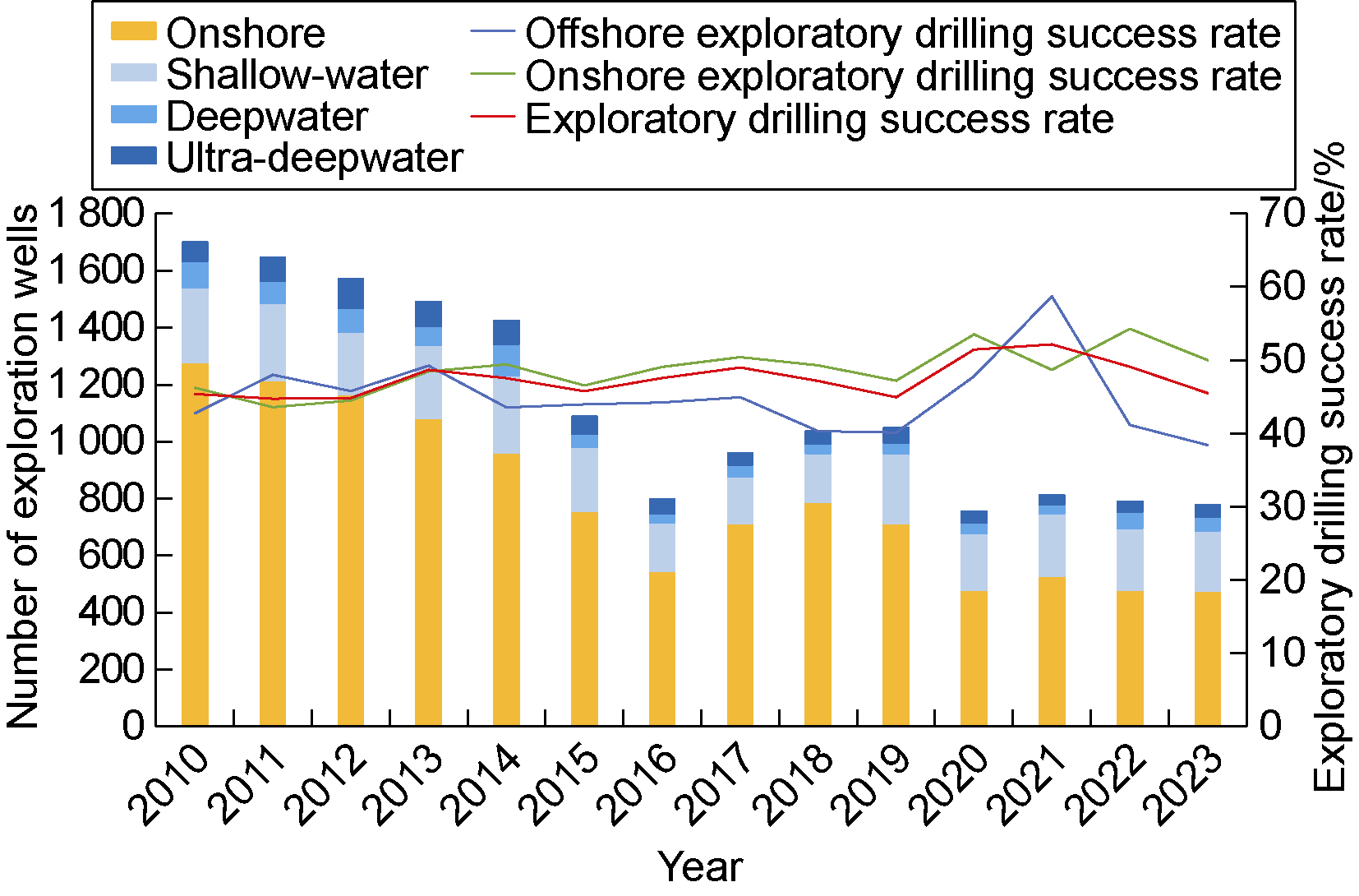 Fig. 3. Histogram of the number and success rate of exploration wells drilled around the world during 2010- 2023[6]. |