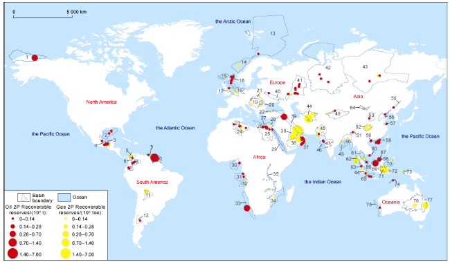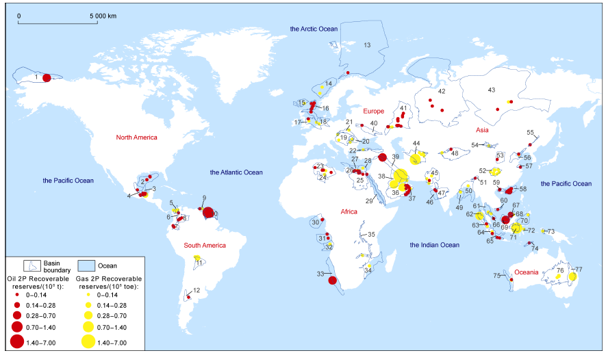 Fig. 5. Distribution of new oil and gas discovered around the world in 2023 [6].1. North Slope Basin; 2.Deep Water Gulf of Mexico Basin; 3. Sureste Basin; 4. Veracruz Basin; 5. Lower Magdalena Basin; 6. Middle-upper Magdalena Basin; 7. Putumayo Basin; 8. Llanos Basin; 9. Trinidad Basin; 10.Guyana Basin; 11. Chaco Basin; 12. Neuquen Basin; 13. Barents Sea Platform; 14. Voring Basin; 15. Faroes-West Shetland Basin; 16. North Sea Basin; 17. Anglo-Dutch Basin; 18. Northwest German Basin; 19. Pannonian Basin; 20. South Carpathian Basin; 21. North Carpathian Basin; 22. Pontids Basin; 23. Tri-Ghadames Basin; 24. Illizi Basin; 25. Upper Egypt Basin; 26. Cyrenaica Basin; 27. Northern Egypt Basin; 28. Nile Delta Basin; 29. Red Sea Basin; 30.Niger Delta Basin; 31. Lower Congo Basin; 32. Kwanza Basin; 33. Southwest African Coastal Basin; 34. Mozambique Basin; 35. East African Rift System; 36. Rub' Al Khali Basin; 37. Oman Basin; 38. Central Arabian Basin; 39. Zagros Basin; 40. Dnieper-Donets Basin; 41. Volga-Urals Basin; 42. West Siberian Basin; 43. East Siberian Basin; 44. Amu-Darya Basin; 45. Indus Basin; 46. Bombay Basin; 47. Deccan Basin; 48.Tarim Basin; 49. Mahanadi Basin; 50. Bengal Basin; 51. Assam Basin; 52.Sichuan Basin; 53.Ordos Basin; 54. South Gobi Basin; 55. Yilan-Yitong Basin; 56. Bohai Gulf Basin; 57.Subei Basin; 58. Pearl River Mouth Basin; 59. Beibu Gulf Basin; 60. Cuu Long Basin; 61. Gulf of Thailand Basin; 62. North Sumatra Basin; 63. Central Sumatra Basin; 64. South Sumatra Basin; 65. West Java Basin; 66. Malay Basin; 67.Northwest Sabah Platform; 68. Brunei-Sabah Basin; 69.Zengmu Basin; 70. Celebes Basin; 71. Kutei Basin; 72. Banggai Basin; 73. Bintuni Basin; 74. Timor Basin; 75. Perth Basin; 76. Eromanga Basin; 77. Bowen-Surat Basins |