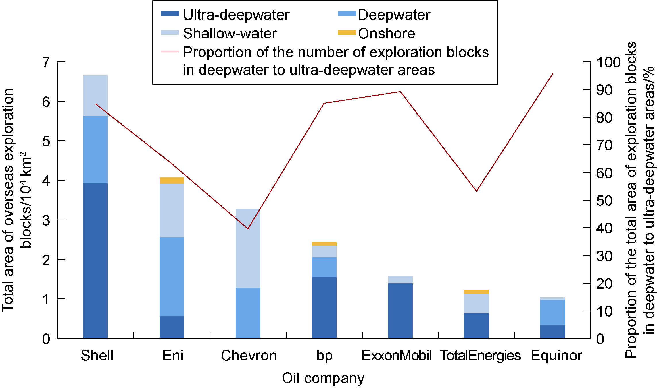 Fig. 8. Histogram of the distribution (onshore/offshore) of overseas exploration blocks acquired by the seven major international oil companies in 2023 [6]. |
