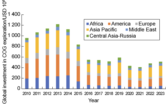 Fig. 1. Histogram of year distribution and regional distribution of global investment in COG exploration since 2010 [7]. |