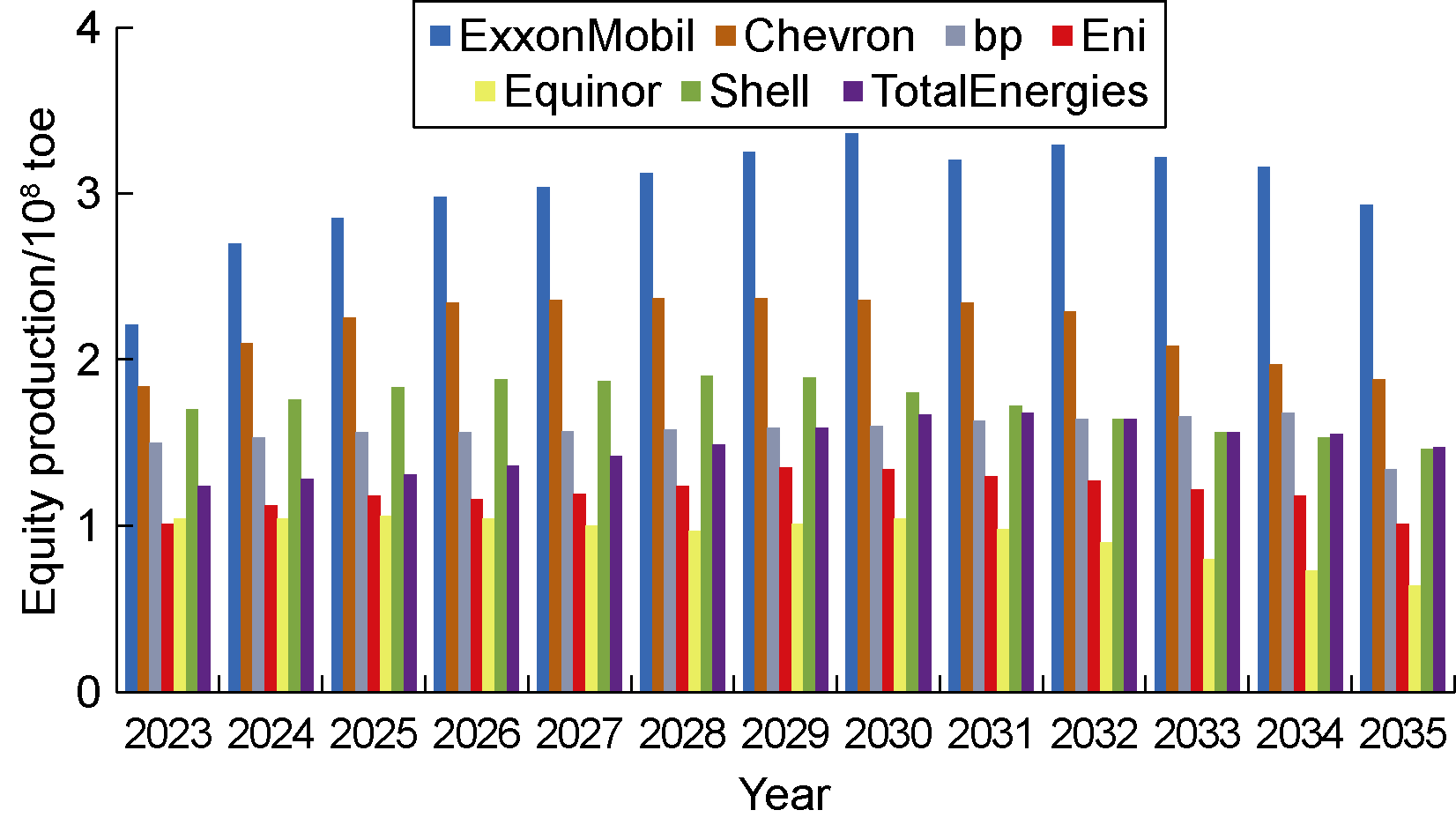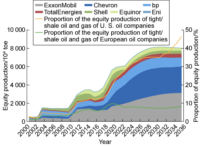 Fig. 16. Equity production of tight/shale oil and gas of the seven major IOCs from 2000 to 2036 [10]. |