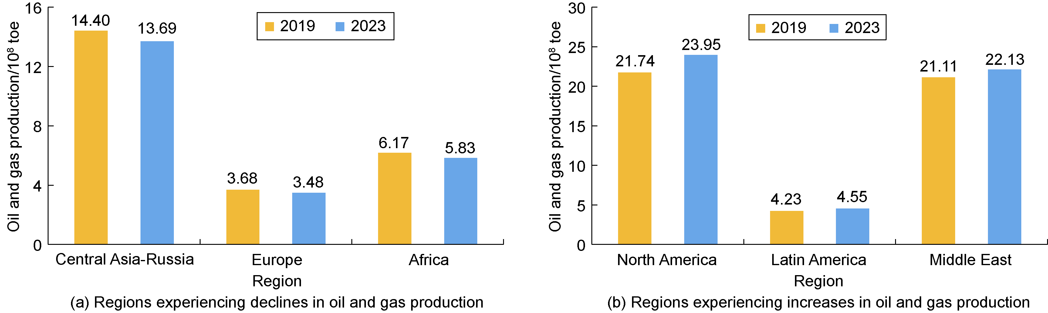 Fig. 3. Comparison of changes in oil and gas production in major regions [10]. |