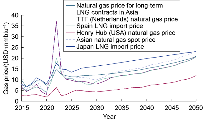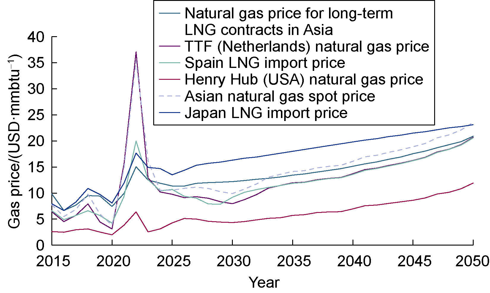 Fig. 5. Global gas prices and forecasts by region from 2015 to 2050 [13]. |