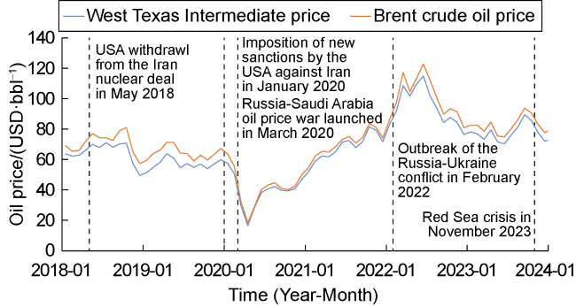 Fig. 4. Crude oil price fluctuation and major geopolitical events during 2018 to 2023 [12]. |