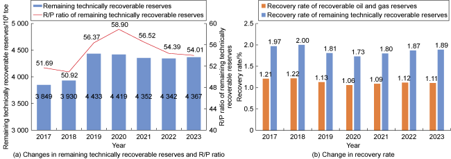 Fig. 7. Changes in the remaining technically recoverable reserves of oil and gas, R/P ratio and recovery rate from 2017 to 2023 [10]. |