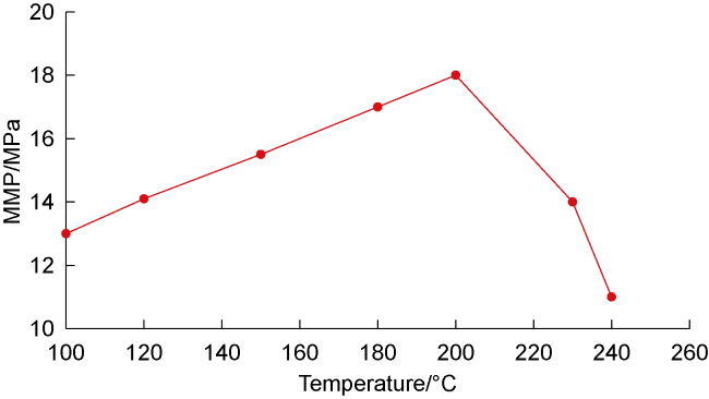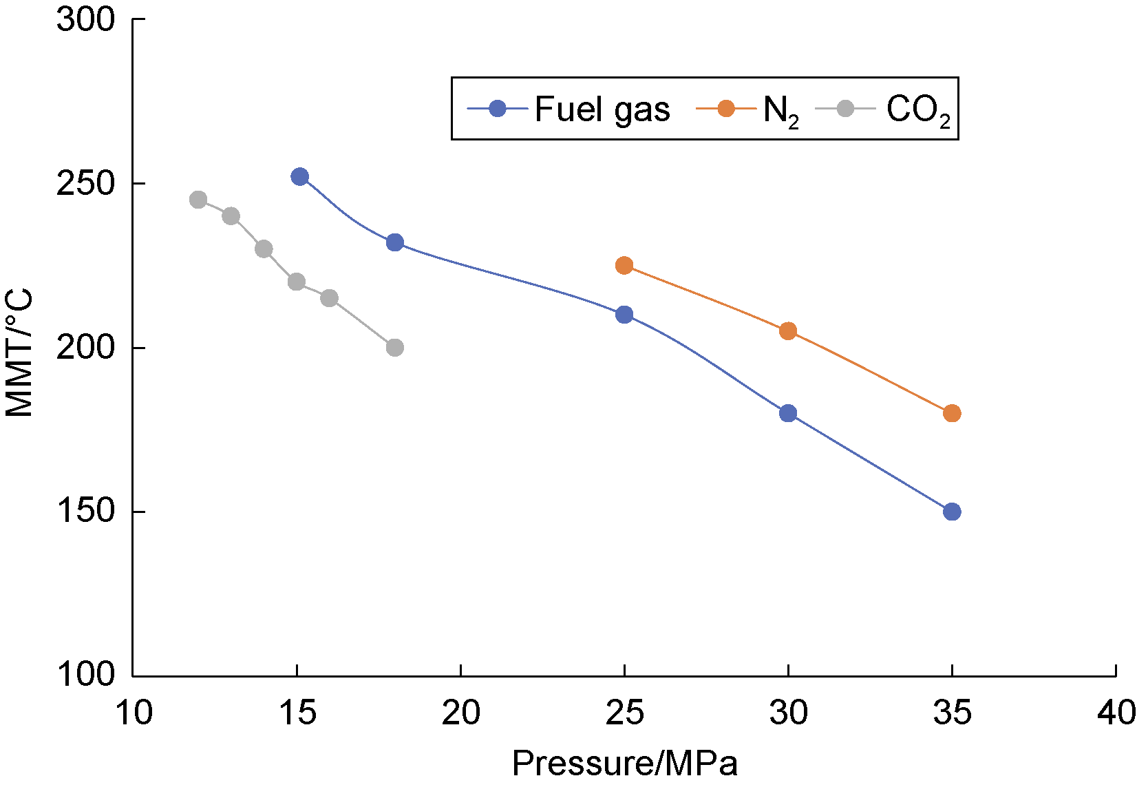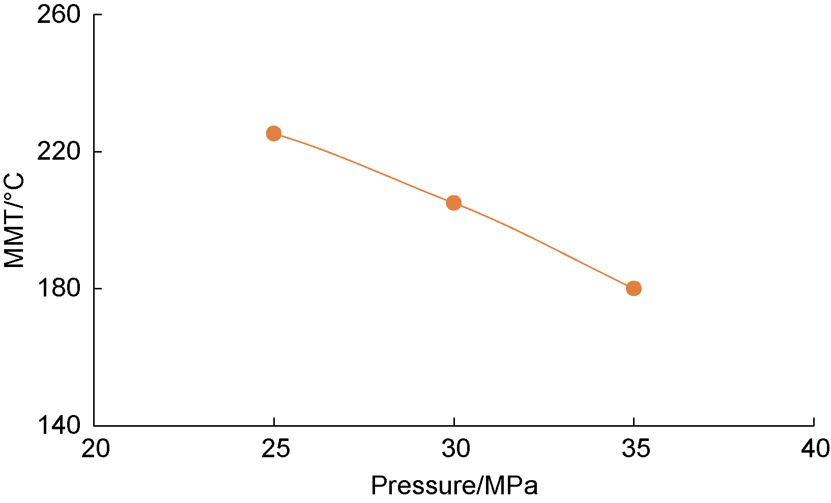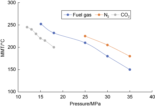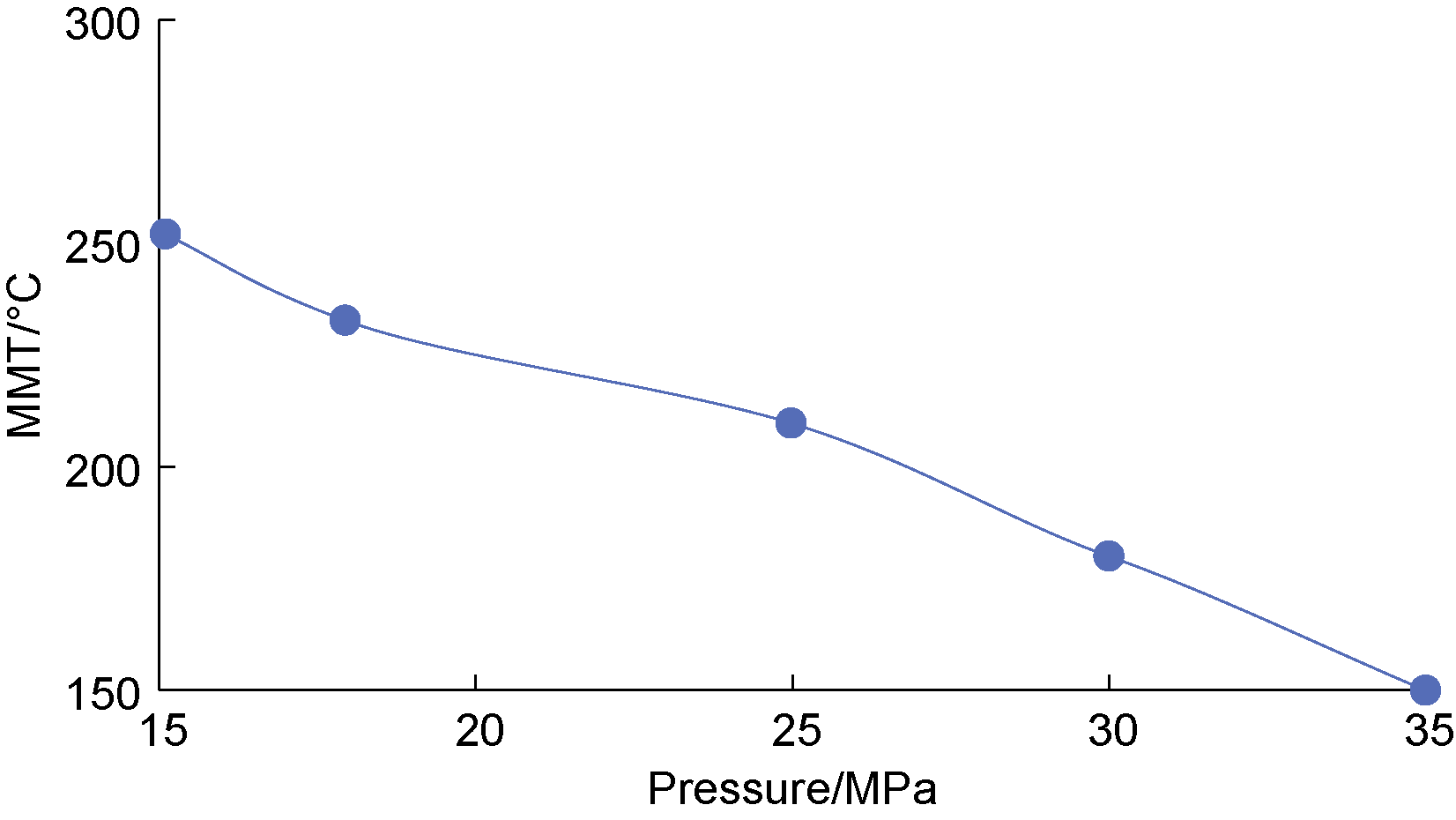 2 and oil in high temperature range (higher than 200 °C). Once the temperature is higher than the MMT, miscibility can be realized, and temperature rise promotes miscibility. Analysis shows that CO