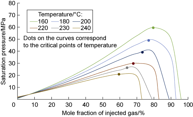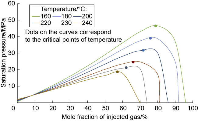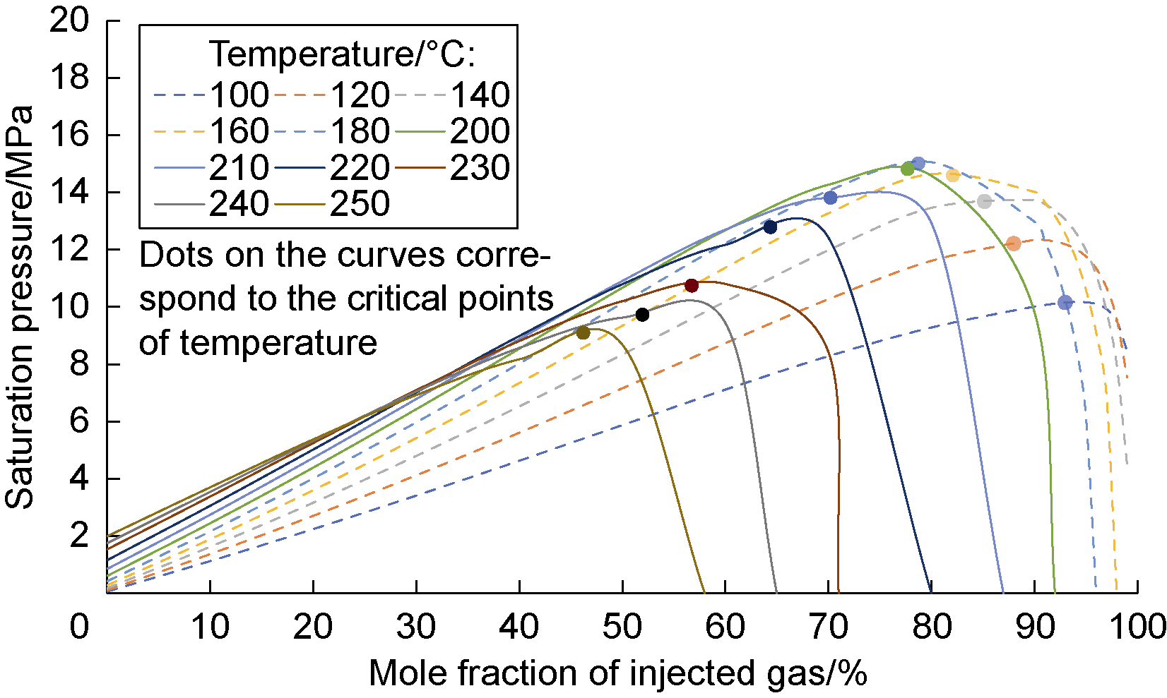 [32]. When the temperature is higher than 140 °C, the light hydrocarbon components are distilled and volatilized with the increase of temperature, which is a forced phase transition of light hydrocarbon components, and the miscibility with CO