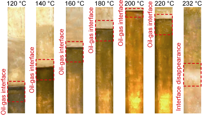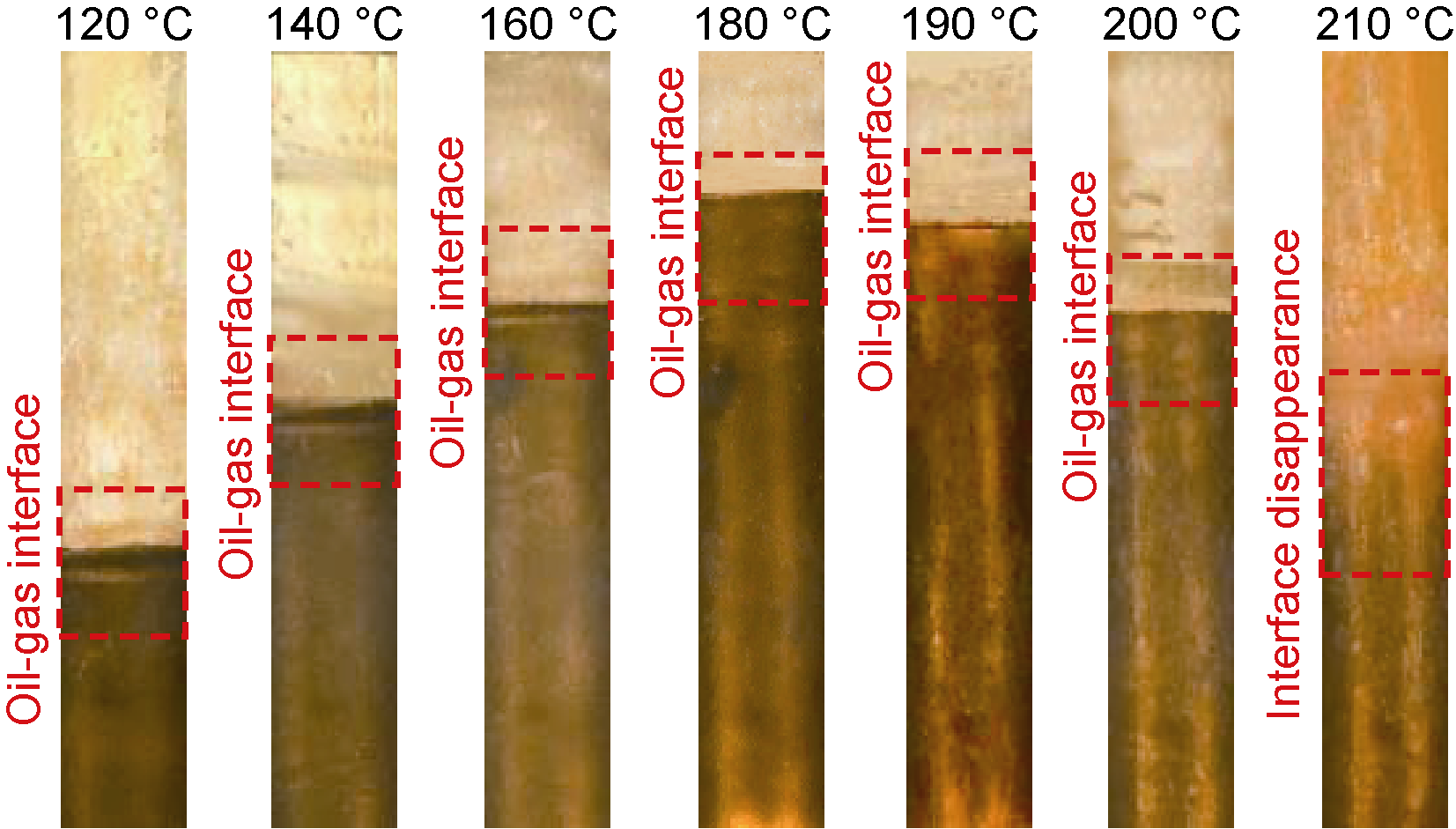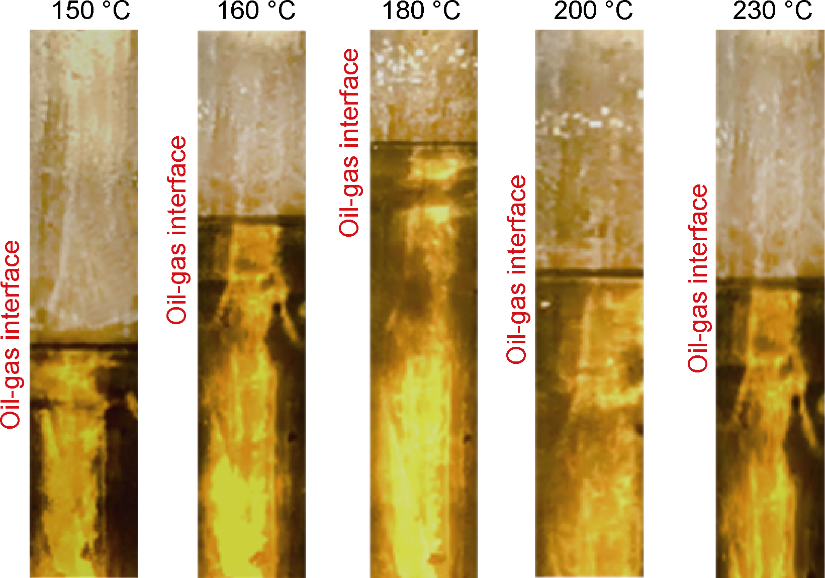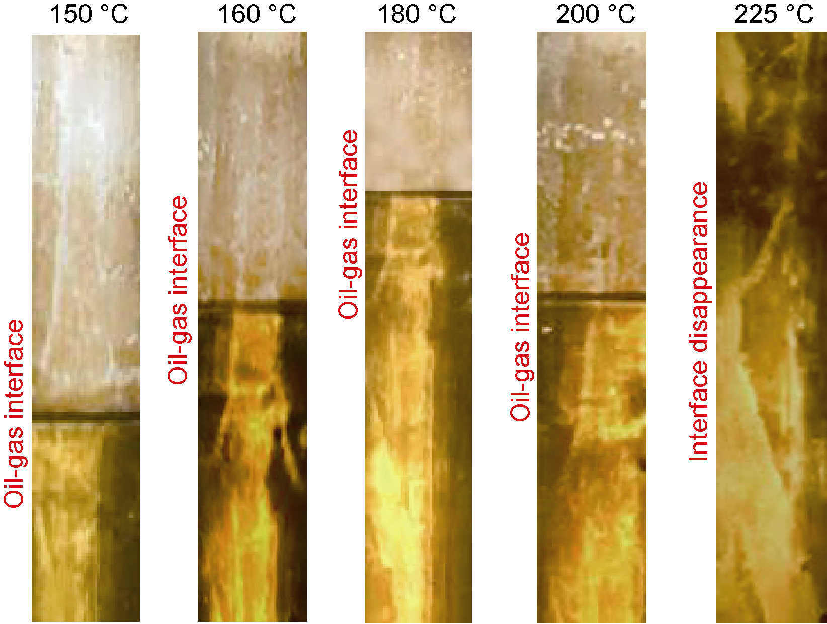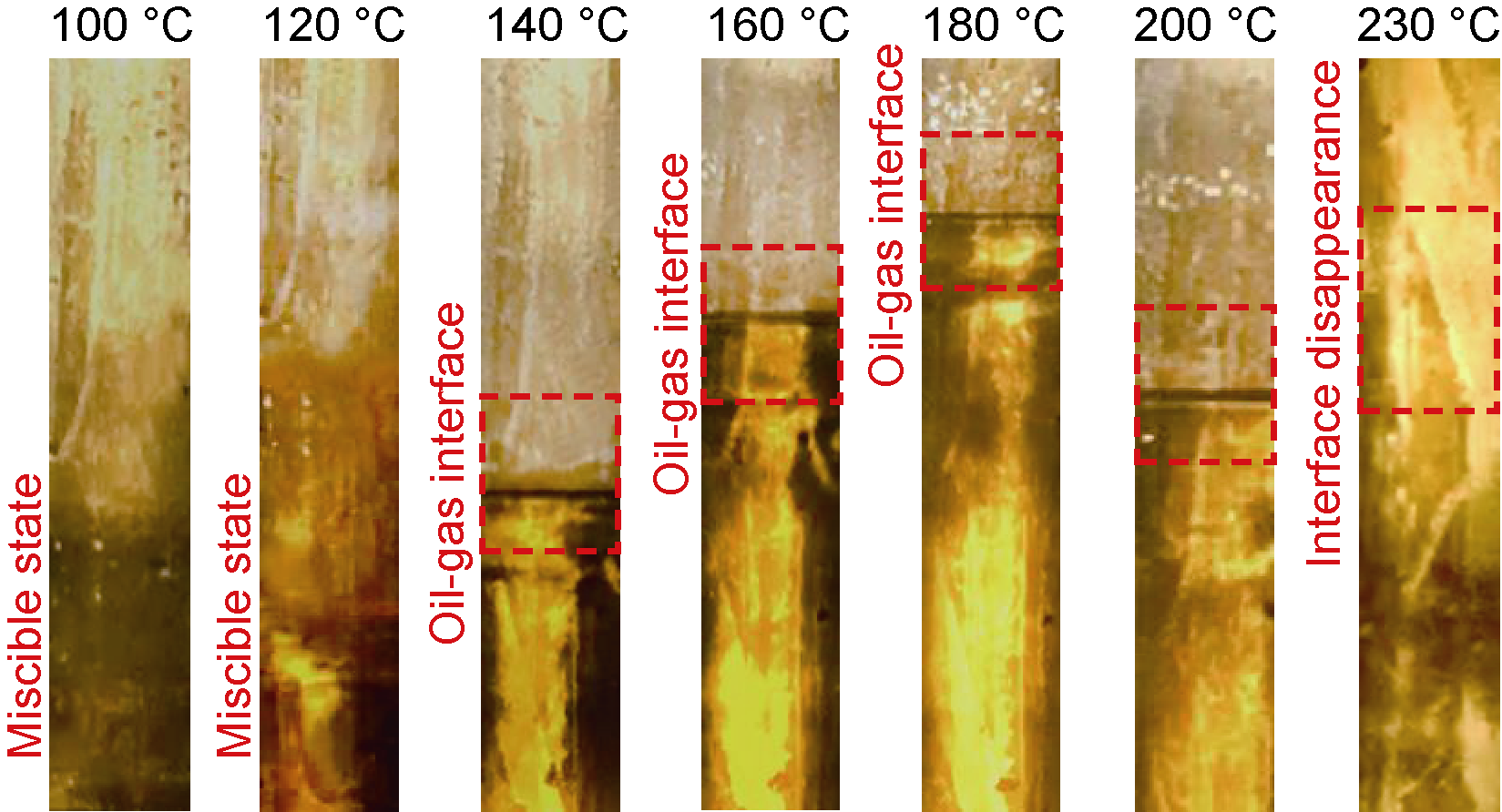 2 and oil phases are not miscible when the temperature increasing to 140 °C, which can be defined as the maximum miscible temperature at low temperature range. At 200 °C, distillation and volatilization of light oil components play a leading role, and heating can promote the miscibility. At 230 °C, CO
