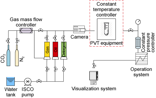 Analysis of the whole experiment process shows that under the pressure of 15 MPa and stepped temperature, the fluids in the PVT cylinder experience a variation from miscibility at low temperature (100 °C) to immiscibility (140-200 °C), and then to miscibility at high temperature (230 °C). In the CO