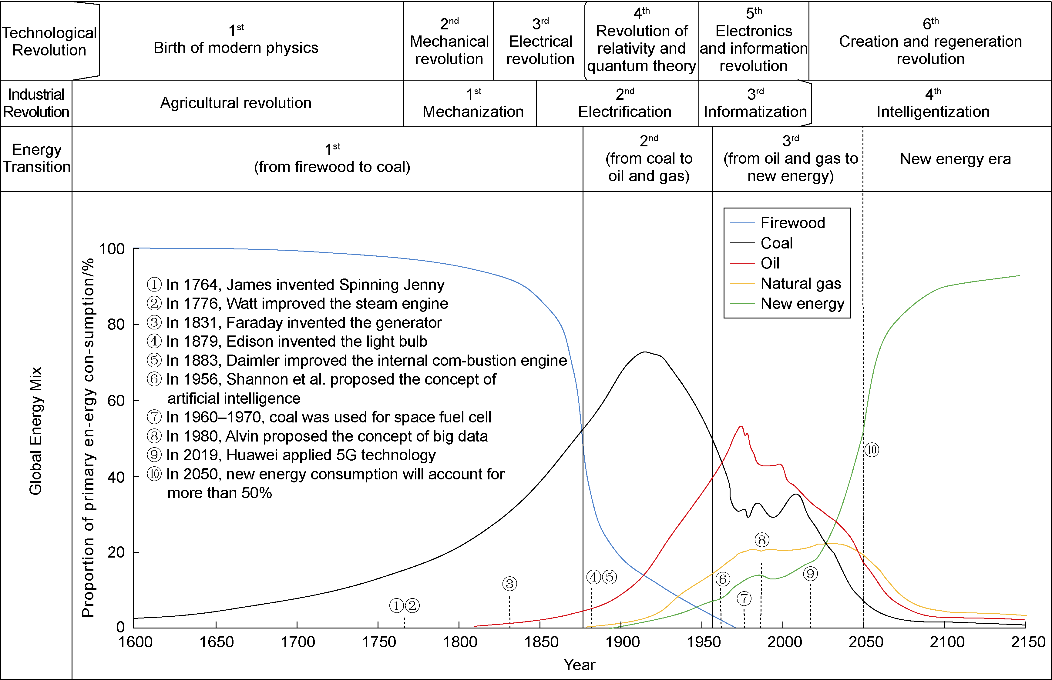 Fig. 1. History of the global energy utilization and development (the data prior to 2023 are sourced from Reference [3], while the subsequent data consist of comprehensive prediction results). |