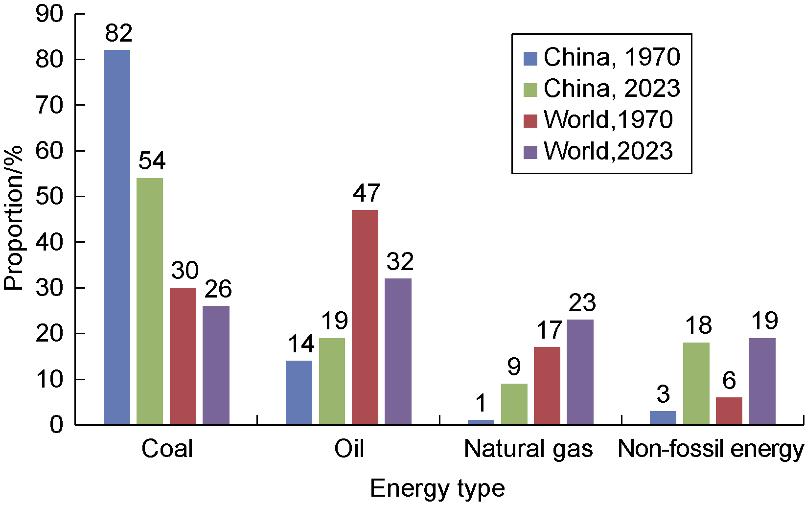 Fig. 2. Changes in the energy mix of the world and China, 1970-2023 [3]. |
