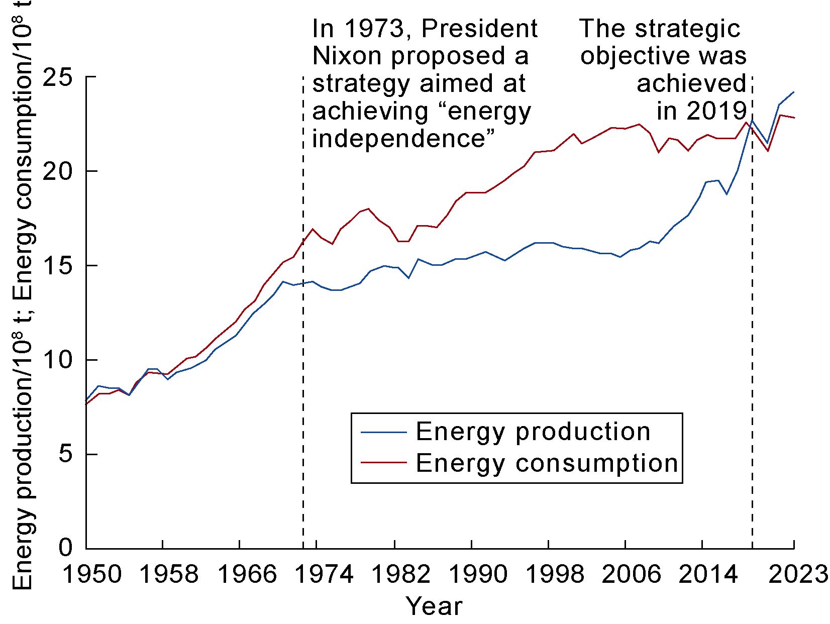 Fig. 3. Energy production and consumption in the United States, 1950-2023 [3]. |