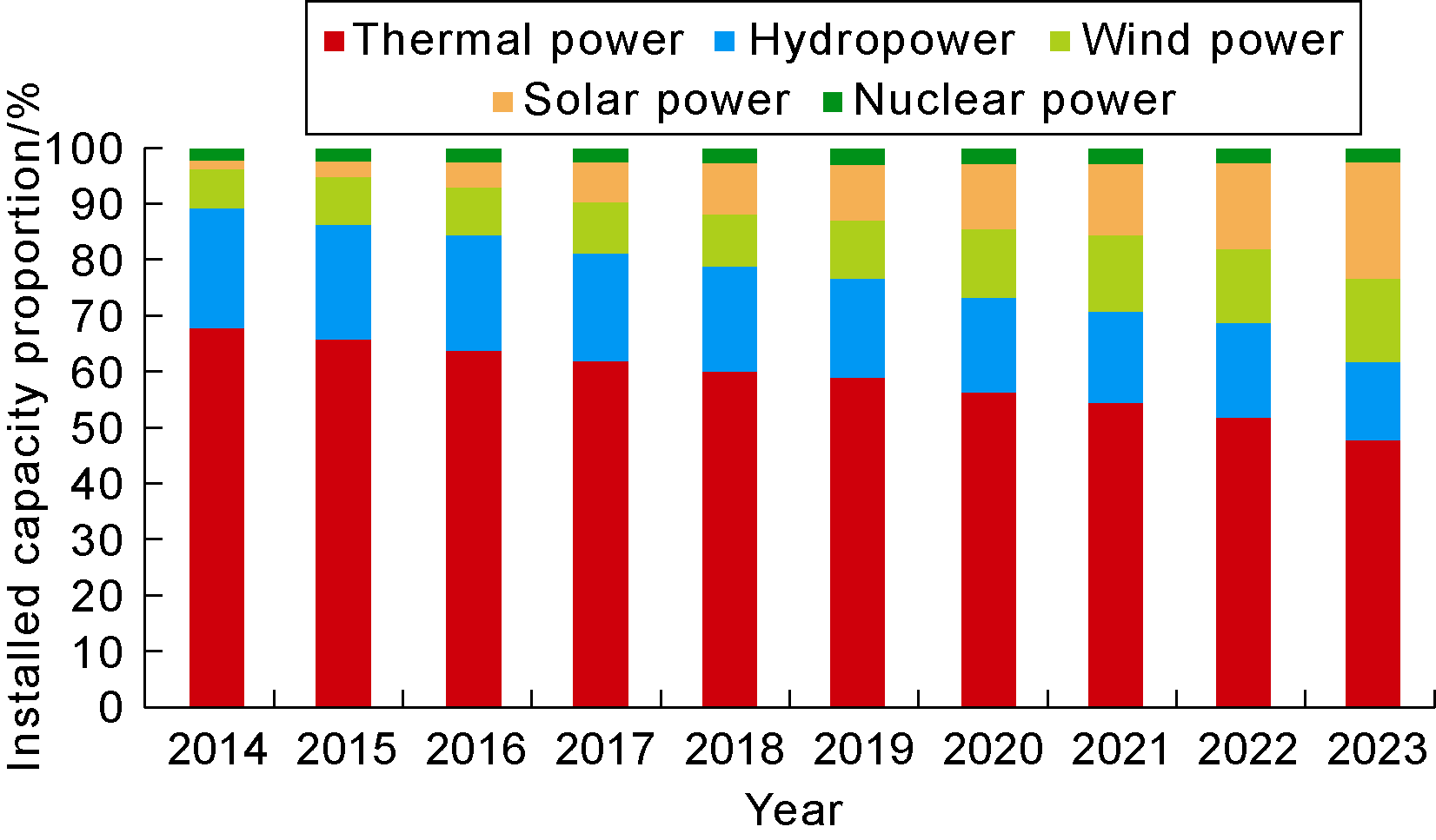 Fig. 4. China’s installed power capacity structure, 2014- 2023 [3]. |