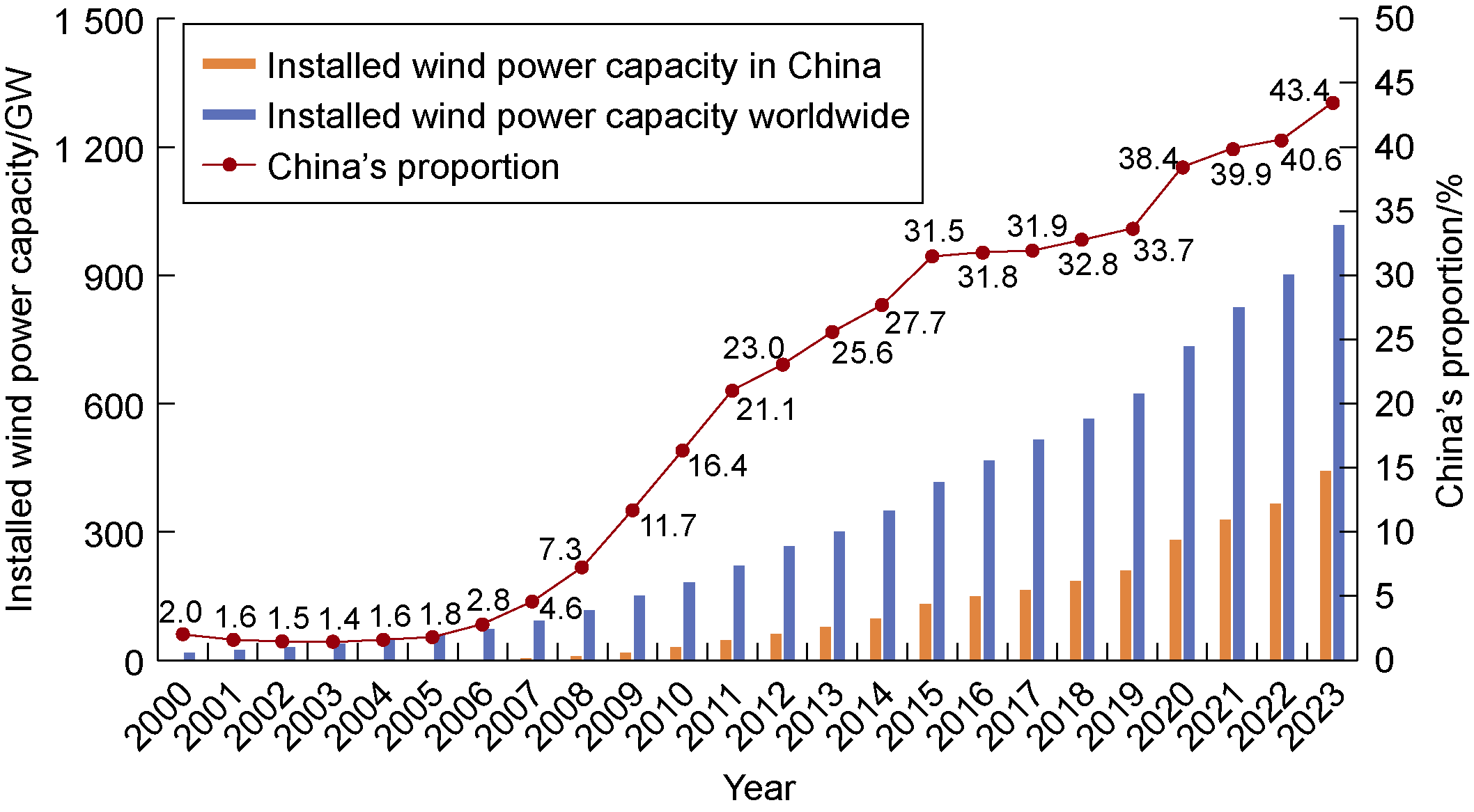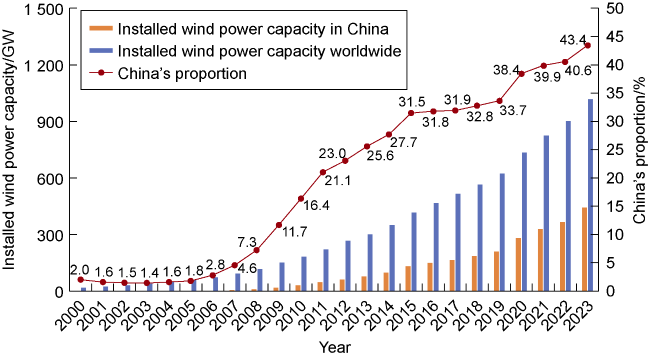 Fig. 5. Comparison of installed wind power capacity in China and worldwide, 2000-2023. |