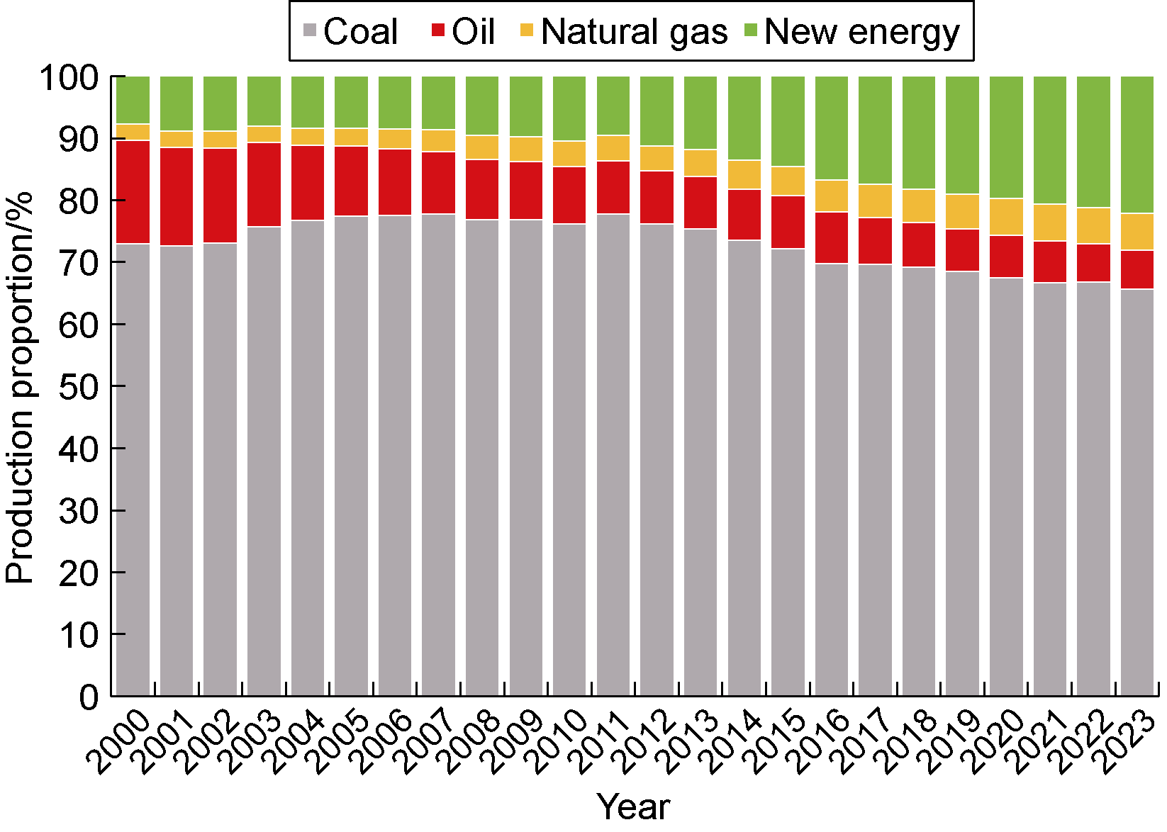 Fig. 7. Changes in the primary energy production structure of China, 2000-2023. |