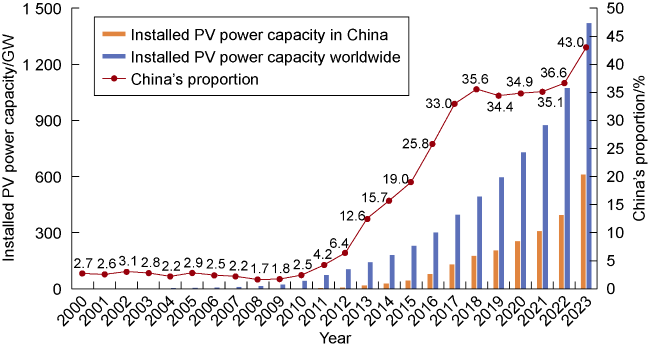 Fig. 6. Comparison of installed solar power capacity in China and worldwide, 2000-2023. |