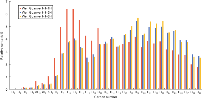 Ro values range from 1.2% to 1.6%, the quality of the generated liquid hydrocarbons was significantly improved, and the volume of the generated gaseous hydrocarbons was also significantly increased. The data obtained from Wells Guye 5HC, Guyeyouping 1 and Guye 2HC (