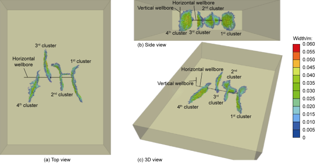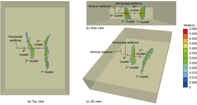 Fig. 11. Numerical simulation results of multi-cluster fracture propagation with temporary plugging. |