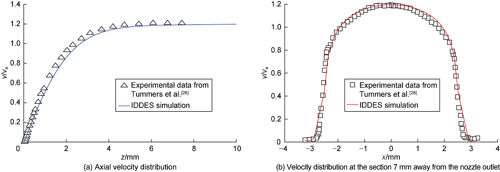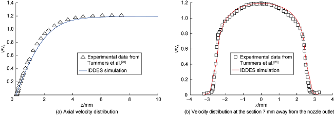 [13] analyzed the influence of nozzle structure parameters on swirling jet through numerical simulation, such as the outlet angle of impeller groove, impeller area and the convergence angle of mixing cavity. Previous studies mainly focused on the velocity distribution and the influence of nozzle structure on the flow field. However, they ignored many detailed characteristics of the flow field. Moreover, little literature has studied the development process of the flow field of swirling jet, such as the development characteristics of turbulence pulsation in the jet shear layer and the evolution process of large vortex structures. In order to deeply understand the flow characteristics of swirling jet and select appropriate engineering application scenarios, this paper intends to use numerical simulation methods to study the flow field evolution of swirling jet. The commonly used numerical simulation methods for studying jet flow field include Reynolds average Navier-Stokes (RANS) method and large eddy simulation (LES) method. RANS method is based on Reynolds averaged equation to study the time-averaging characteristics of flow field, which has the advantage of low computational complexity. However, it can only predict the average velocity field, average scalar field and average force of turbulence