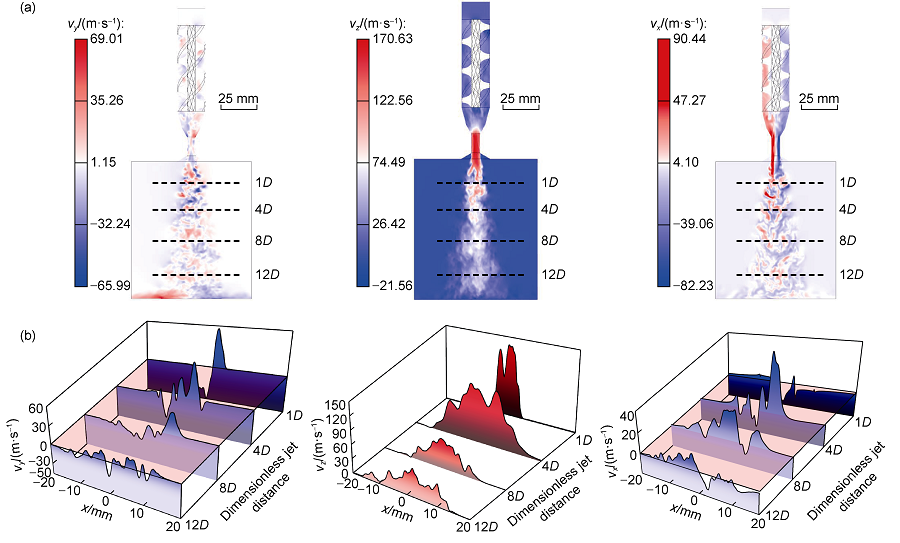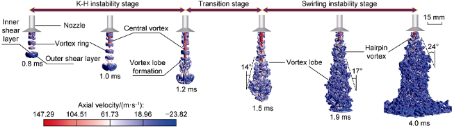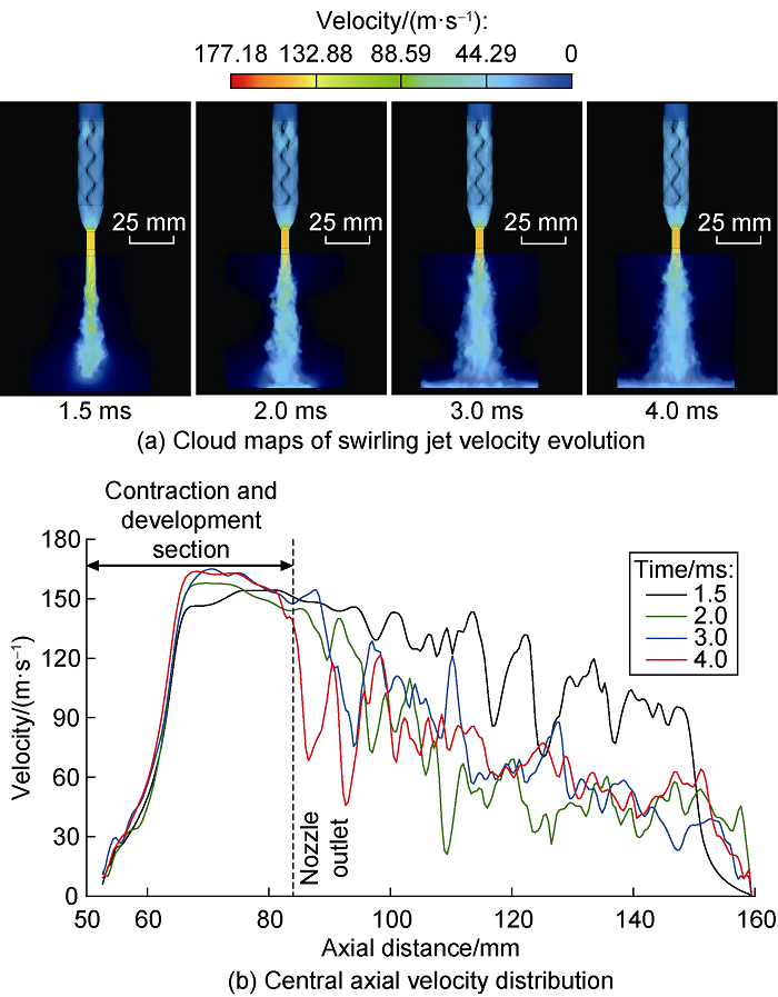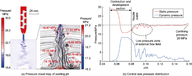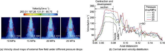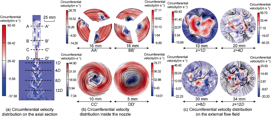 The fundamental reason for the efficient rock-breaking ability of swirling jet is its unique swirling flow field structure. Many scholars have done a lot of researches on the flow field distribution of swirling jet. Bu et al.