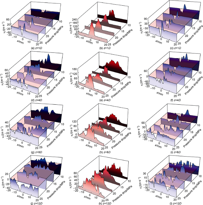 [11] found that the radial velocity distribution of swirling jet was in the shape of "M" under submerged conditions. The tangential velocity generated by the swirling jet increased the jet diffusion angle, but the axial symmetry characteristic of the tangential velocity was weakened under submergence conditions. Li