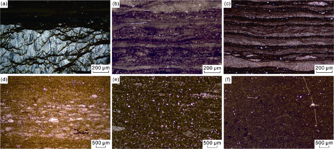 Fig. 1. Microscopic characteristics of common shale lithofacies types in Jiyang Depression. (a) Organic rich sparitie laminar calcareous shale; (b) Organic rich cryptocrystalline laminar calcareous shale; (c) Organic rich cryptocrystalline laminar calcareous- argillaceous shale; (d) Organic rich cryptocrystalline layered calcareous-argillaceous shale; (e) Organic cryptocrystalline layered calcareous-argillaceous shale; (f) Organic cryptocrystalline massive calcareous-argillaceous shale. |