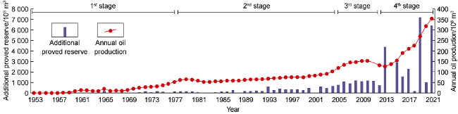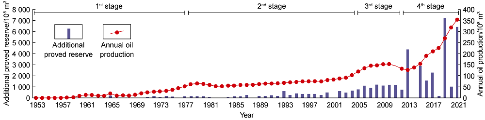 Fig. 8). (1) In the first stage (1953-1977): structural trap exploration, middle and shallow structural traps were mainly explored, the cumulative proved gas reserves were 1511×10
