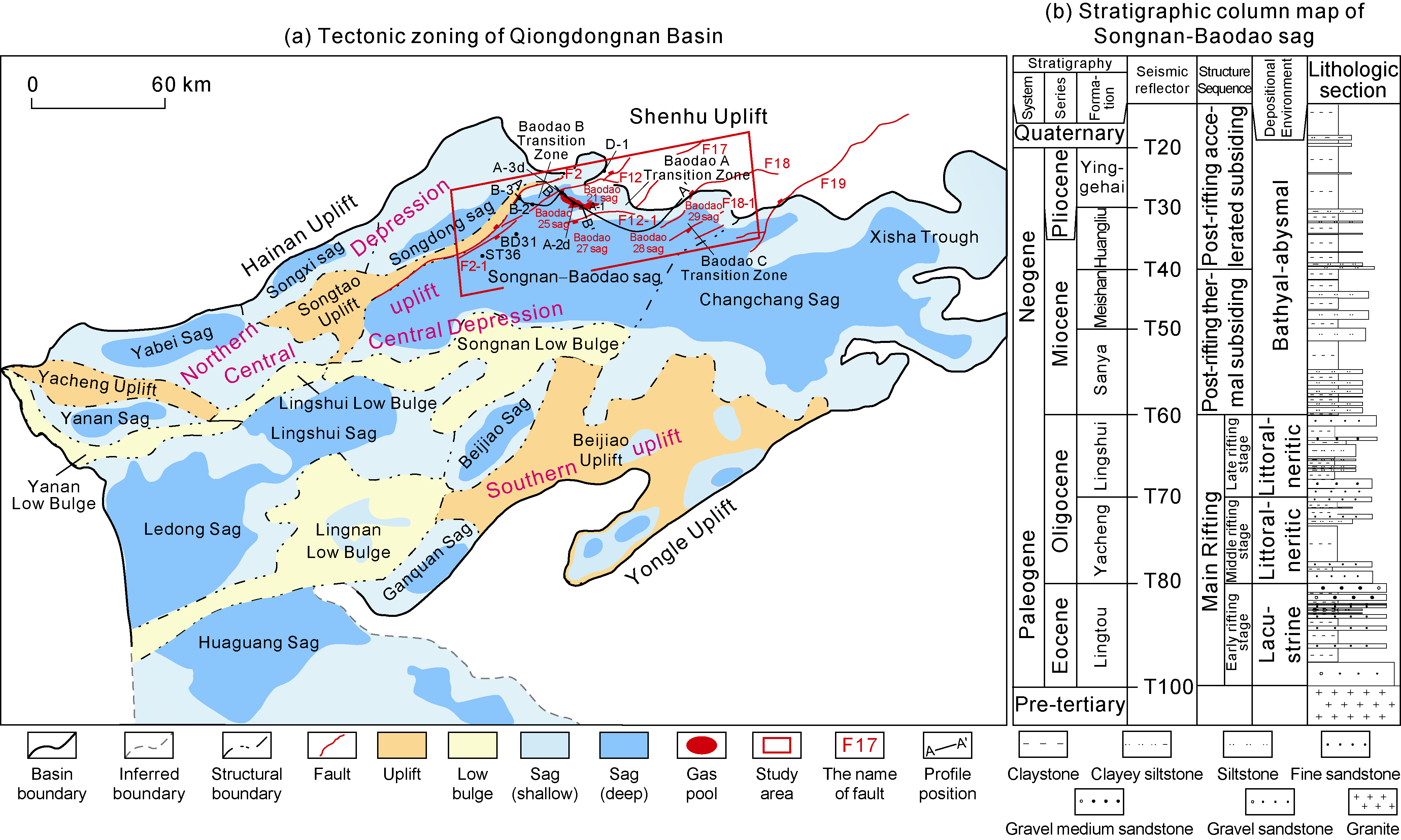The Qiongdongnan Basin is a Cenozoic extensional basin in the northern part of the South China Sea, controlled by the interaction of regional tectonics such as the South China Sea spreading, the Pacific Plate and the Indo-Chinese Massif rotation. It is divided into primary tectonic units such as the Northern sag, the Central Uplift, the Central sag and the Southern Uplift, and secondary tectonic units such as the Yanan sag, the Ledong sag, the Lingshui sag, the Songnan sag, the Baodao sag, the Changchang sag, the Songnan Low Bulge and the Lingnan Low Bulge from north to south (