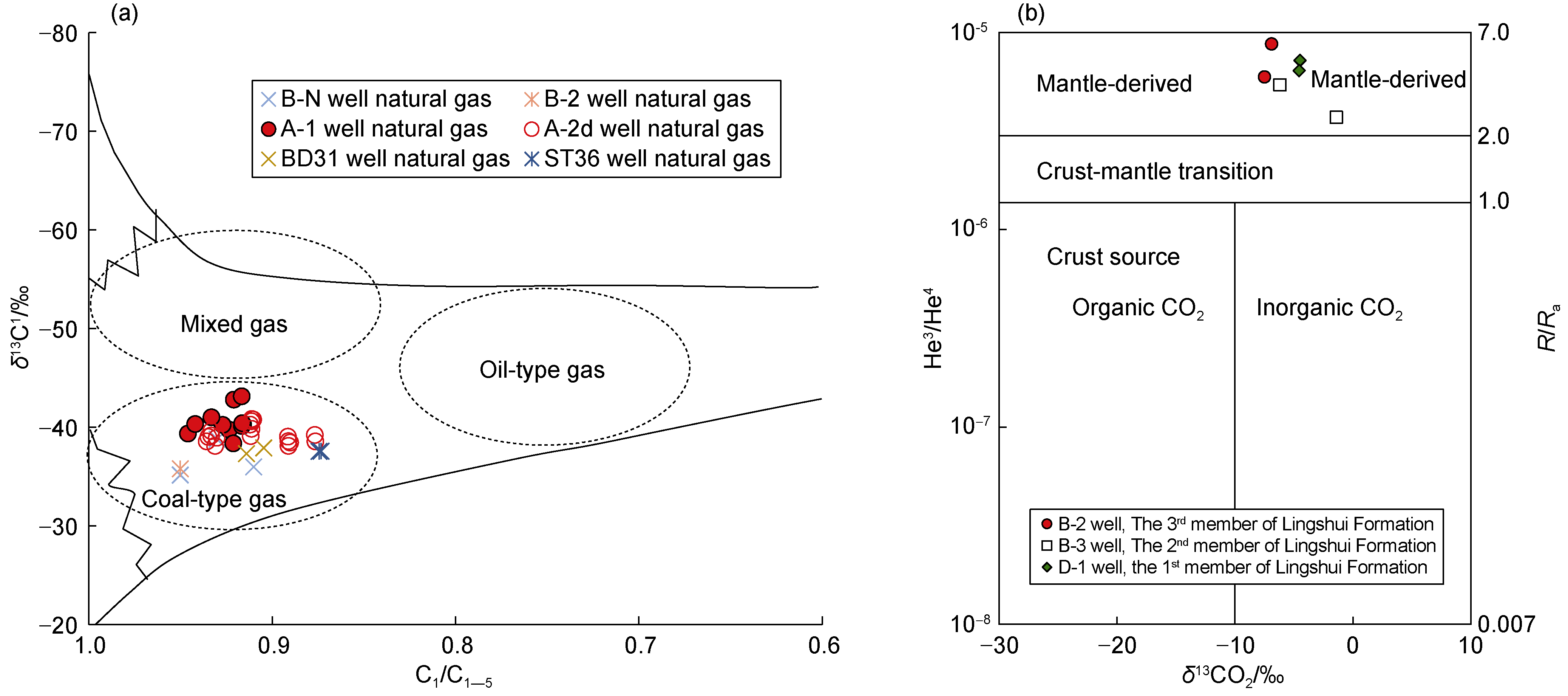[25⇓-27]. However, the scale of the discovered gas reservoirs is small, the gas components are highly variable, and no breakthrough in exploration scale has been obtained. In the northern slope area, the hydrocarbon content of the Paleocene Lingshui Formation in the B gas-bearing structure ranges from 12.0% to 79.2%, mostly below 50%, with dry components and dry coefficients of 0.9-1.0; the hydrocarbon gas content of the Middle Neogene Sanya Formation in the BD31 and ST36 gas-bearing structures found in the sag zone ranges from 96.6% to 98.7%, with wet components and dry coefficients of 0.87-0.91. The Fault depression - fault depression transition period formed by the North-East and North-East-East series of faults added during the conversion period respectively did not attract much attention from researchers in the early exploration of the Songnan-Baodao sag