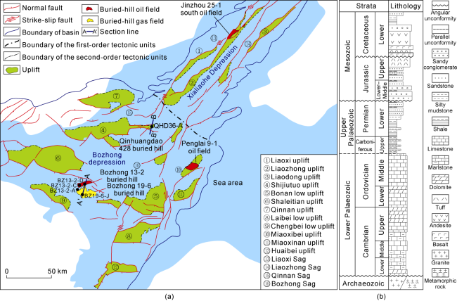 Fig. 1. Structural outline map and comprehensive stratigraphic column diagram of buried hills in the Bohai Bay Basin. (a) Structural outline map and distribution of Archaeozoic metamorphic buried hill oil and gas fields in the Bohai Sea; (b) Comprehensive stratigraphic column diagram of the Bozhong Sag. |