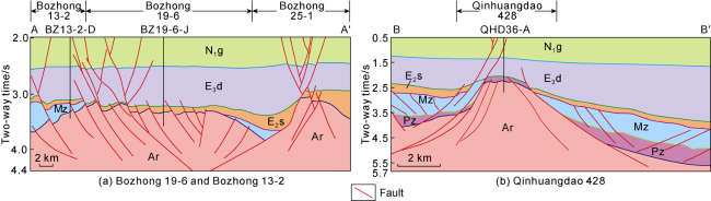 Fig. 2. Profiles of Bozhong 19-6, Bozhong 13-2 and Qinhuangdao 428 buried hills. Profile positions in |