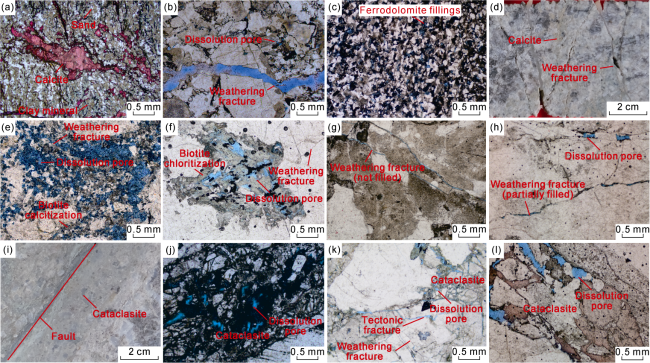 | Leached zone | Obvious weathering fractures enlarged by dissolution, and intracrystalline dissolved pores | Weathering fractures and intracrystalline dissolved pores | |