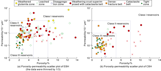 Note: Data source from 27 wells in the study area. The statistics of the leached zone and the disaggregation zone in the weathering crust exclude the data from the superposed cataclasite belt. Values in brackets are average values. |