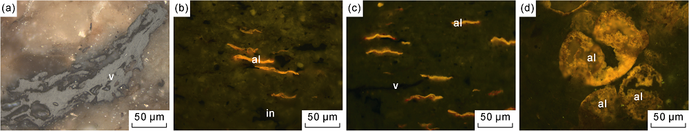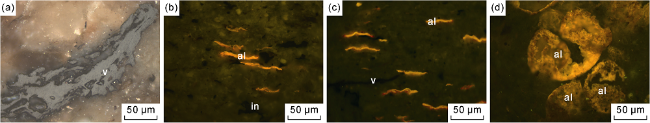 Fig. 2. Photomicrographs of source rocks of the Yingcheng Formation in Shuangcheng area. (a) Transmission light, 1423.59 m, Well A; (b) Blue light, 1437.75 m, Well C; (c) Blue light, 1442.45 m, Well C; (d) Blue light, 1258.00 m, Well D. al—lamalginite; v—vitrinite; in—inertinite. |