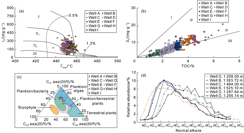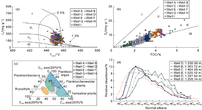 Fig. 3. Sources of organic matters in source rocks of the Yingcheng Formation in Shuangcheng area. (a) Relationship between Tmax and IH; (b) Relationship between TOC and S2; (c) Triangle diagram of regular sterane; (d) Carbon number distribution of normal alkane. |
