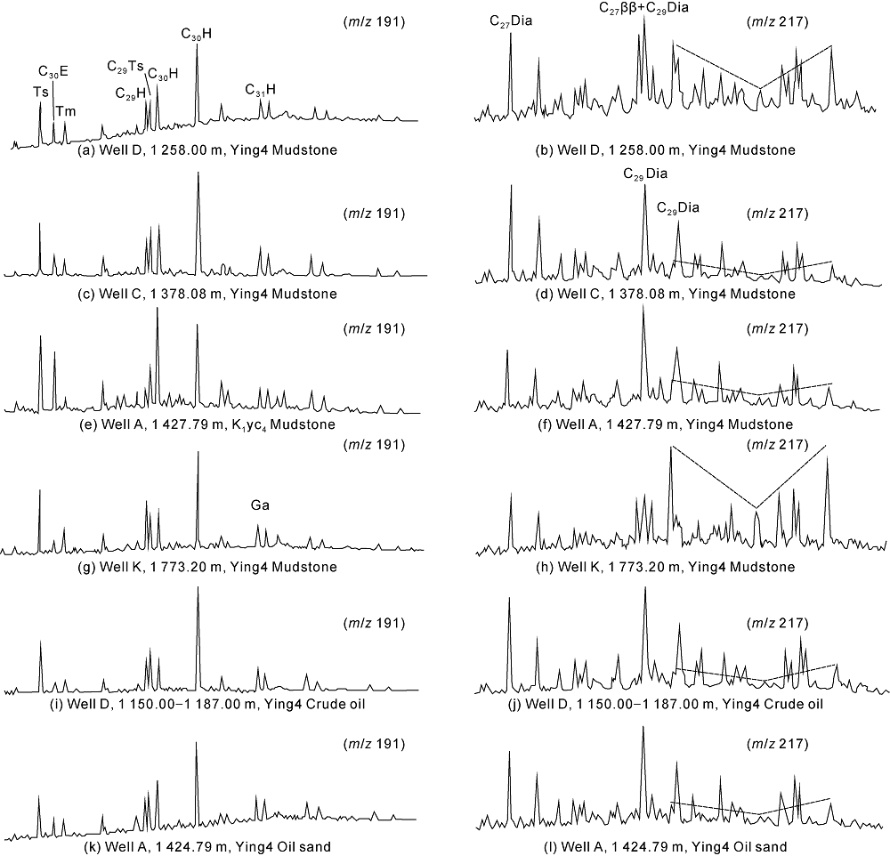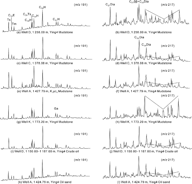 Fig. 5. Typical sterterpene mass spectra of source rock and oil in the Yingcheng Formation in Shuangcheng sag [20]. |